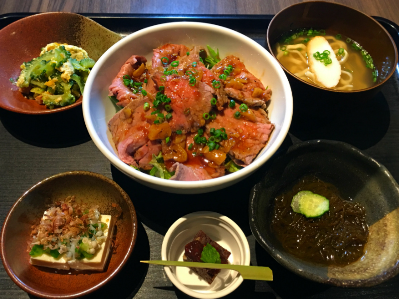 メイン、ライス、沖縄そば、小鉢3種、デザート小 、フリードリンク